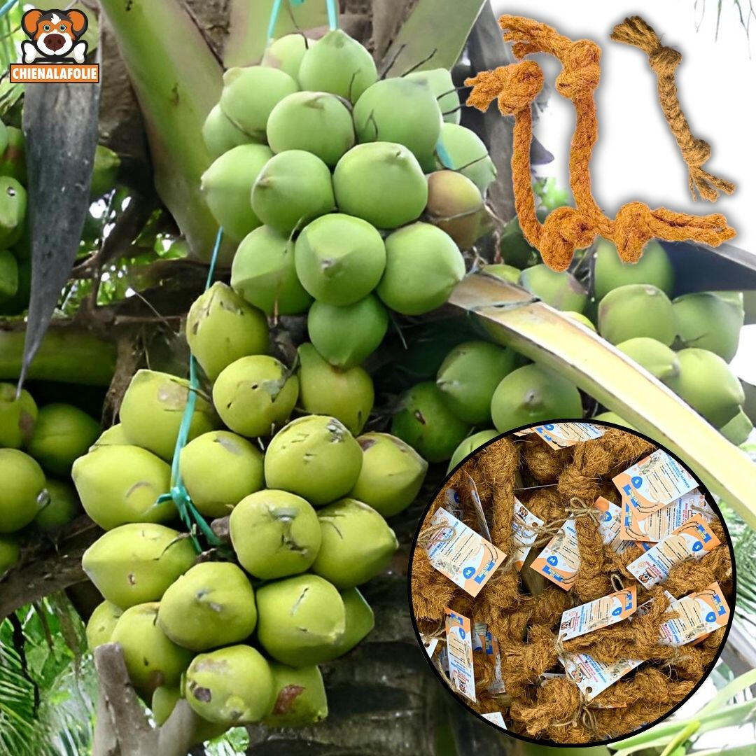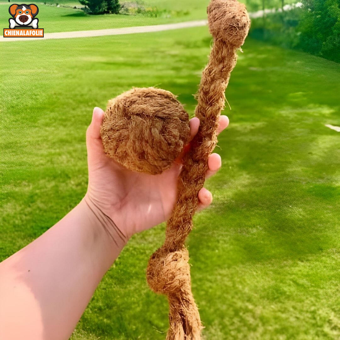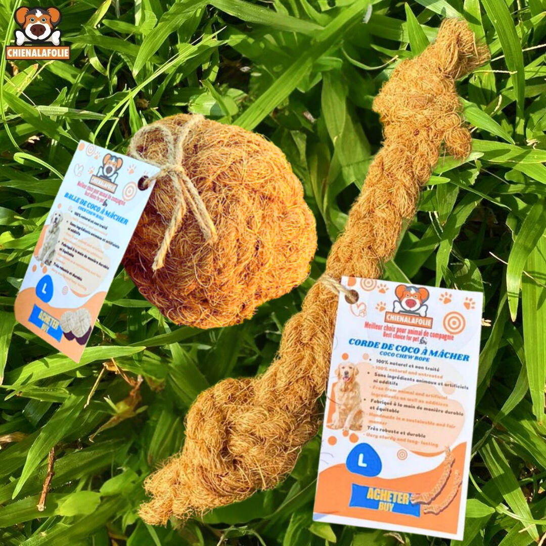 LE DUO "BROSSE À DENTS" NATURELLEObtenez la balle ET la corde dans un seul ensemble. Fabriqués uniquement à partir de fibres de noix de coco, ces jouets agissent comme un exfoliant naturel pour les dents.🥥 Double Action : La corde pour le tir (Tug) et la balle pour le rapport.💪 Fibre Robuste : Texture abrasive qui nettoie les dents en profondeur.🌱 100% Écologique : Une fois détruit, c'est retour à la terre (compostable).🚫 Zéro Toxines : Aucune colle toxique. Juste de la nature.