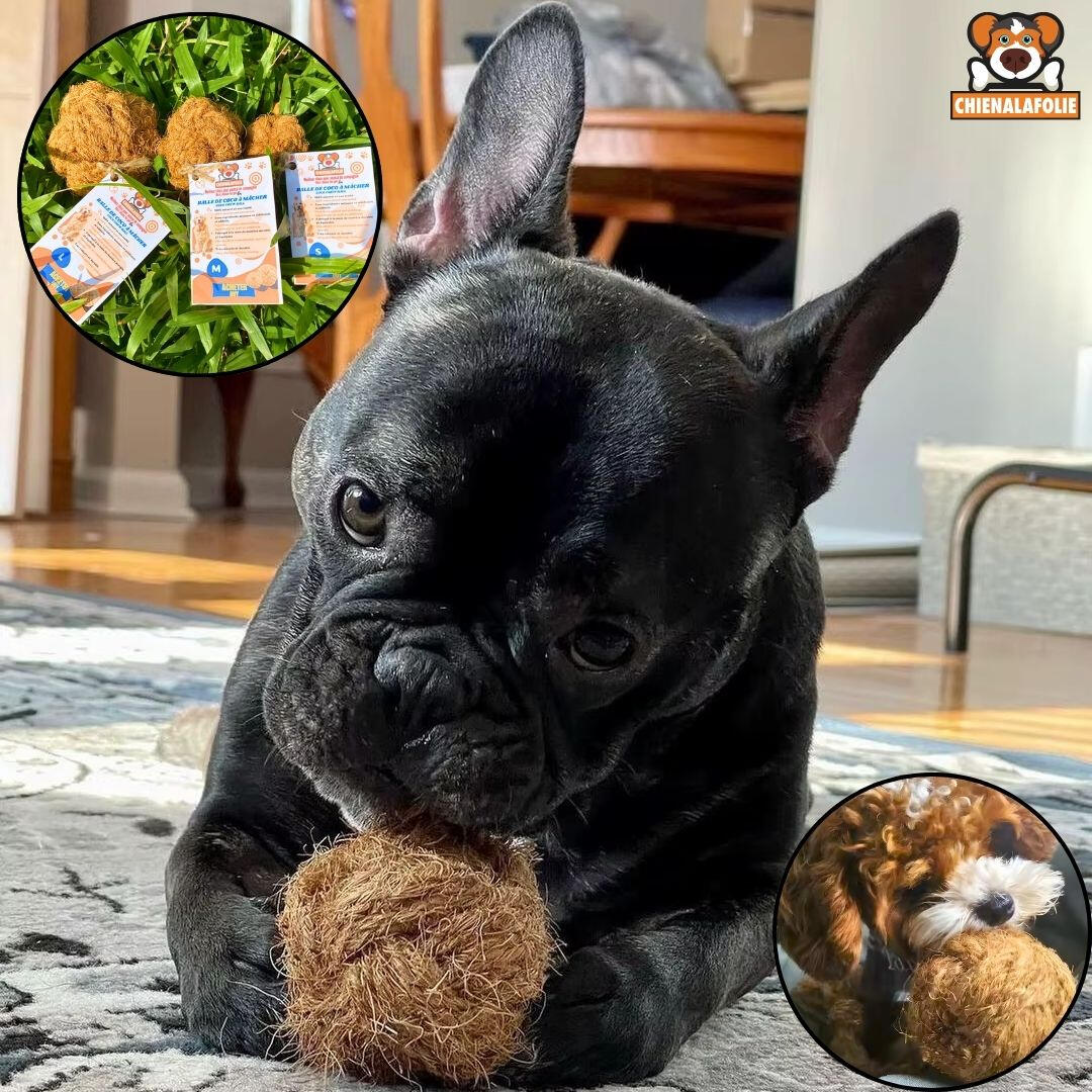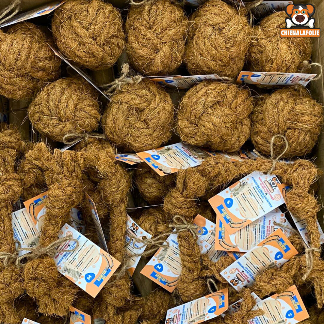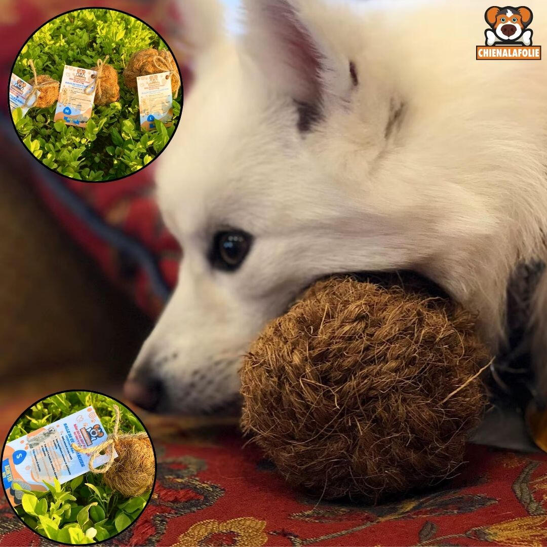 LE DUO "BROSSE À DENTS" NATURELLEObtenez la balle ET la corde dans un seul ensemble. Fabriqués uniquement à partir de fibres de noix de coco, ces jouets agissent comme un exfoliant naturel pour les dents.🥥 Double Action : La corde pour le tir (Tug) et la balle pour le rapport.💪 Fibre Robuste : Texture abrasive qui nettoie les dents en profondeur.🌱 100% Écologique : Une fois détruit, c'est retour à la terre (compostable).🚫 Zéro Toxines : Aucune colle toxique. Juste de la nature.
